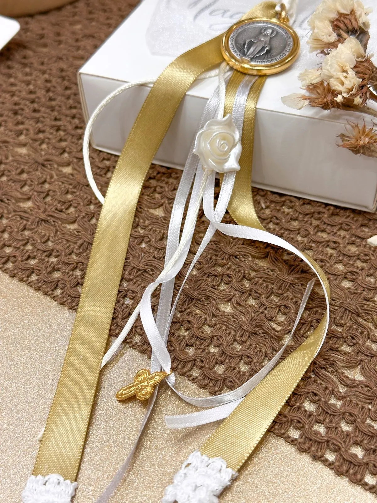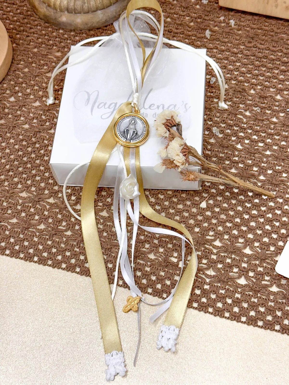 Bendición. Imagen principal de la Medalla Milagrosa en alpaca italiana, mide 3 cm de diámetro, cruz y flor en acrílico que representan las ave marías.
