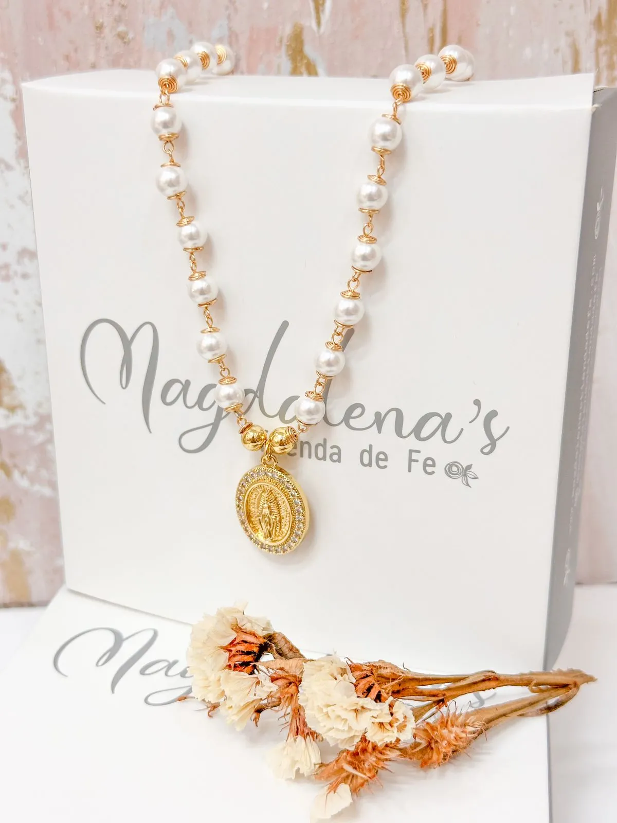 Cadena en perlas shell entorchada artesanalmente en alambre en rodio, tiene un baño de oro, la cadena se puede graduar y su medalla en rodinada con cristales.