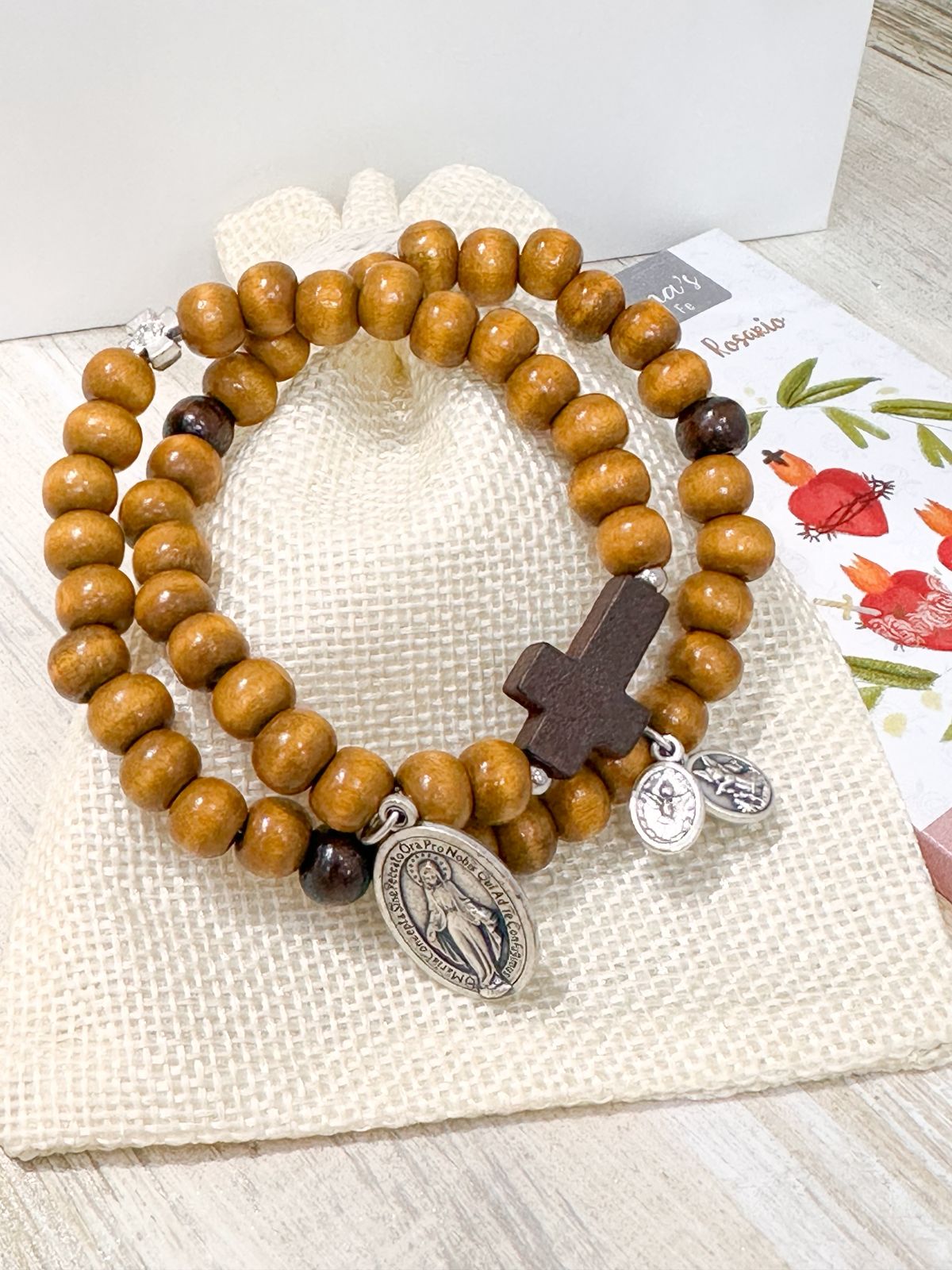 Camándula elástica elaborada con pepitas y cruz en madera. Incluye medallas en alpaca italiana con las advocaciones de la Medalla Milagrosa, Sagrada Familia, Espíritu Santo, San Miguel Arcángel y Santo Ángel de la Guarda.