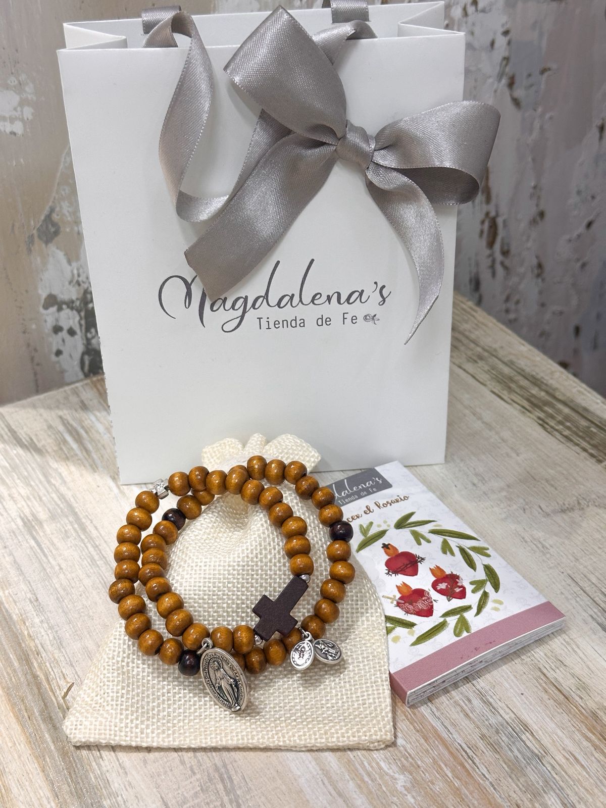 Cuenta con todas las piezas necesarias para rezar el Santo Rosario, en un formato práctico para llevar en la mano y acompañar la oración en cualquier momento del día.