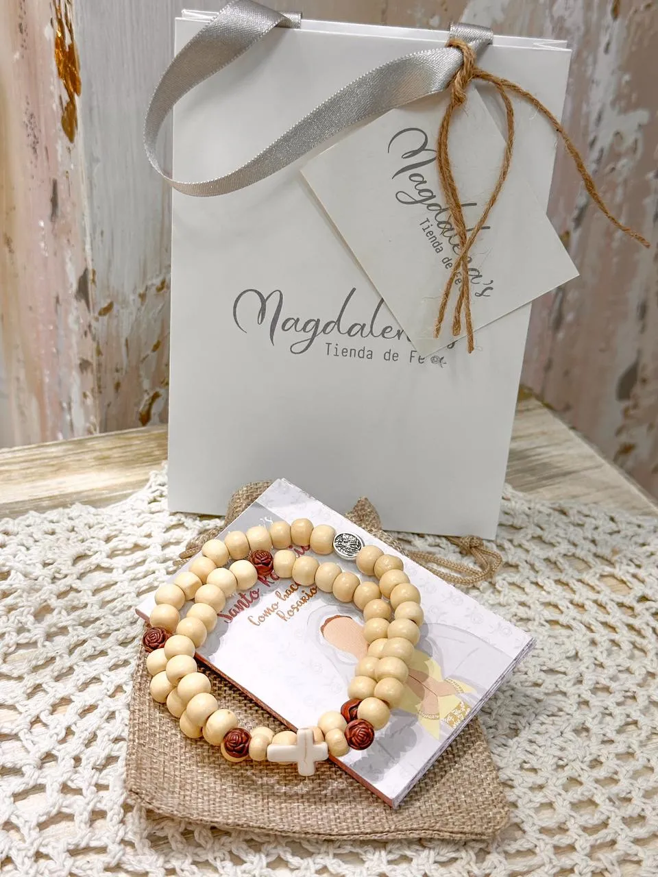 se envía empacada para regalo, en cajita de la marca, bolsa de yute y guía para hacer el santo rosario.