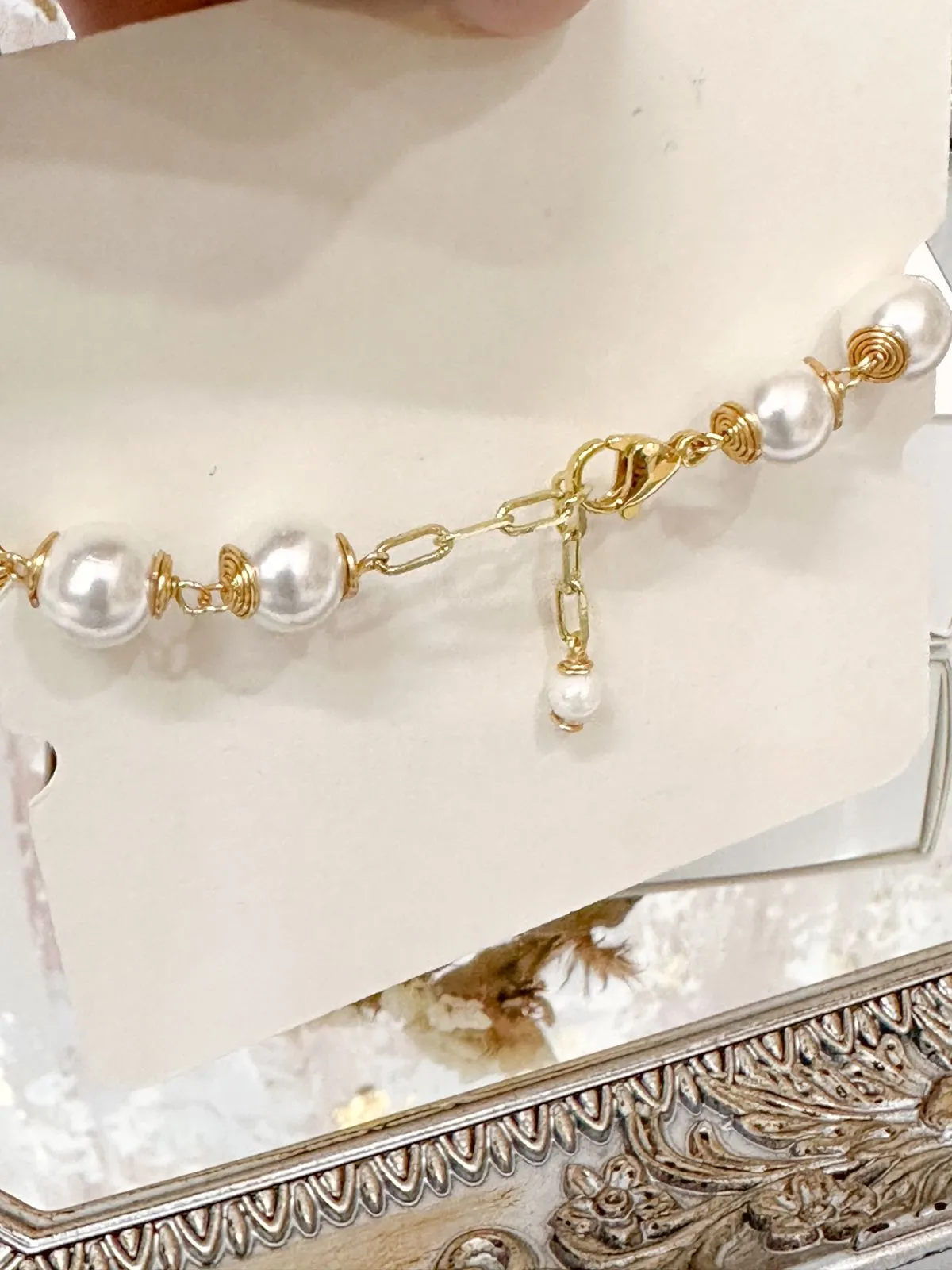 Denario en perlas shell o polvo de nácar, herrajes dorados en rodio con baño de oro, tiene una cadena extensora para graduar.