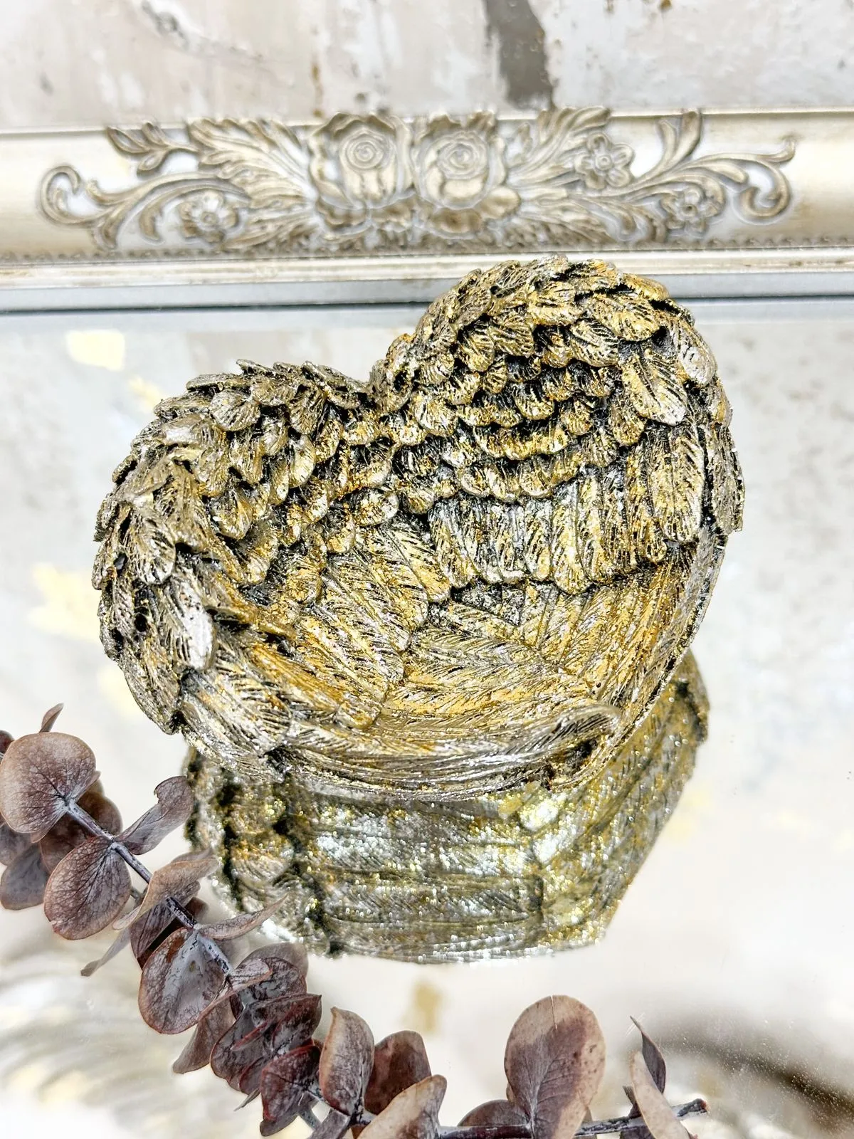 Joyero en marmolina de alitas de ángel formando un corazón. pintura con acrílicos, laca semi mate y laminilla de oro. empacada para regalo.