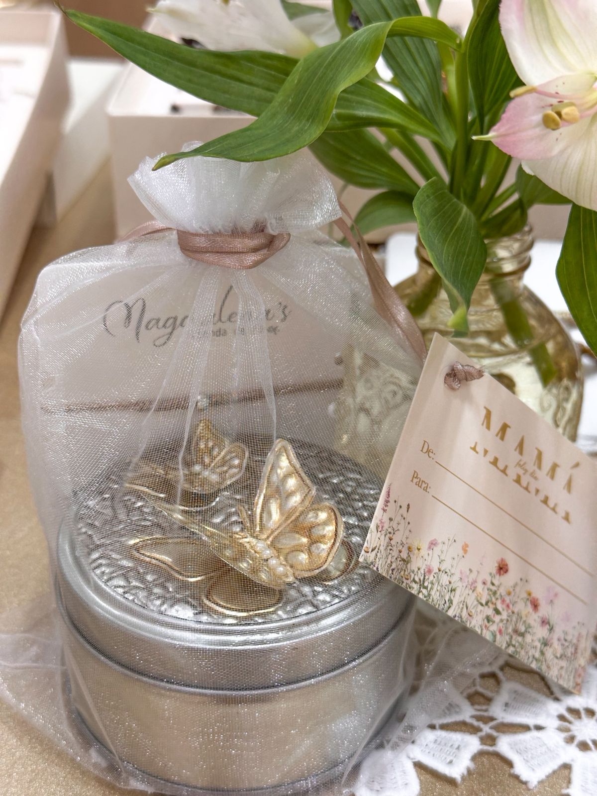 Incluye una vela en lata repujada y pintada a mano, decorada con delicadas mariposas con detalles en perlitas, elaborada en cera vegetal con aroma, ideal para crear un ambiente cálido y especial.