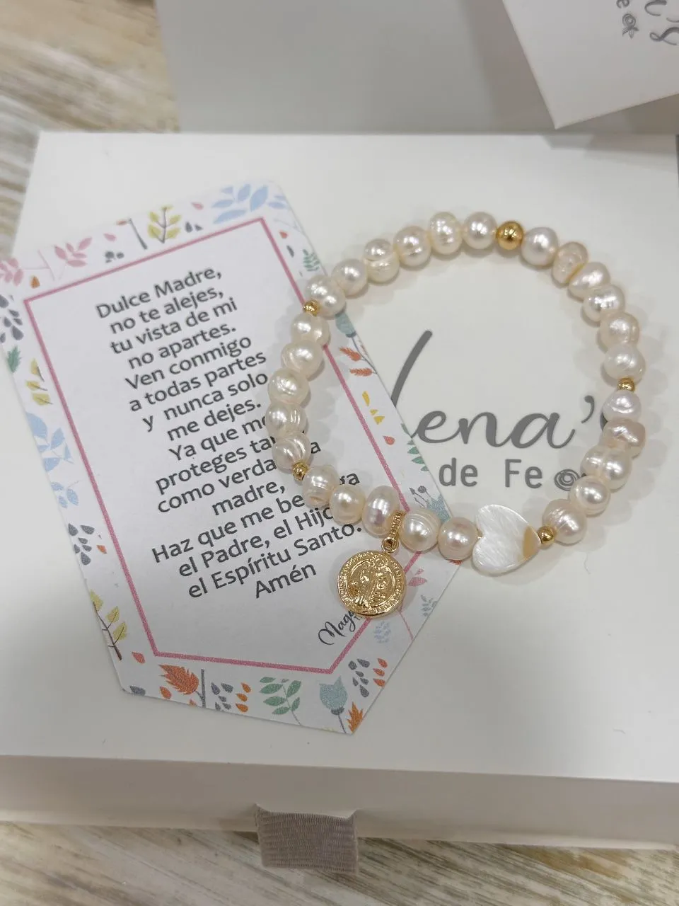 Pulsera elaborada en perla de río y herrajes en oro laminado.