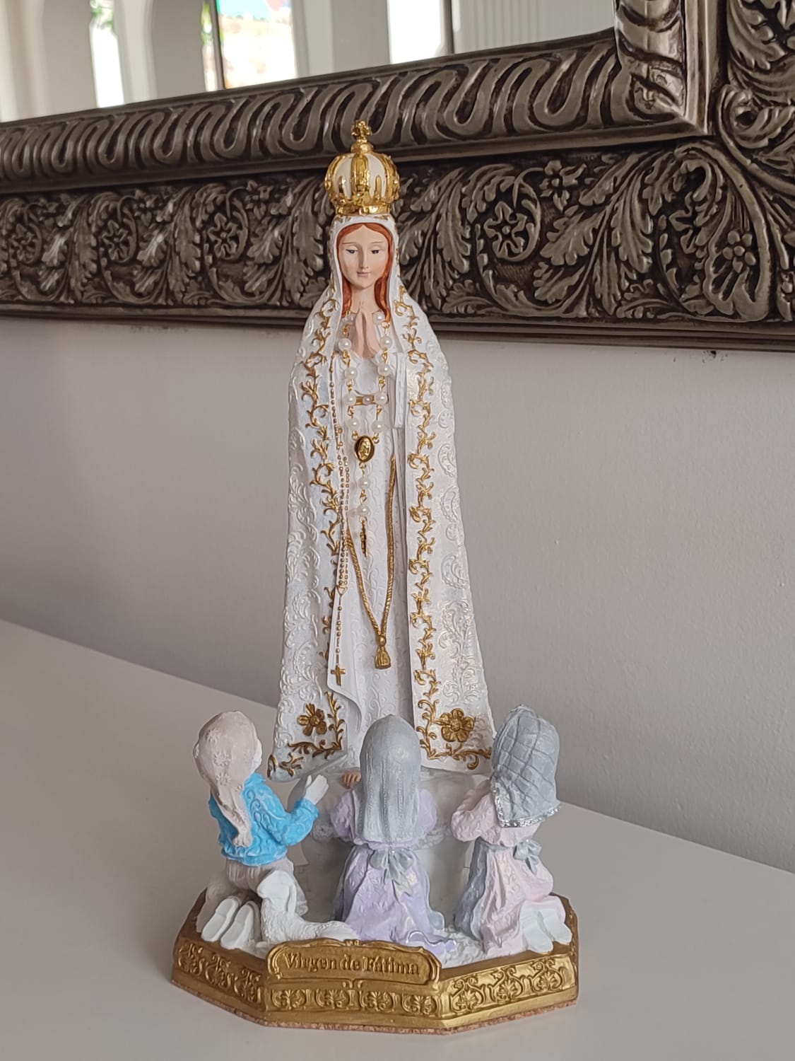 Tener la imagen de la Virgen de Fátima con los pastorcitos en el hogar es un recordatorio constante de su mensaje de esperanza, oración y paz.