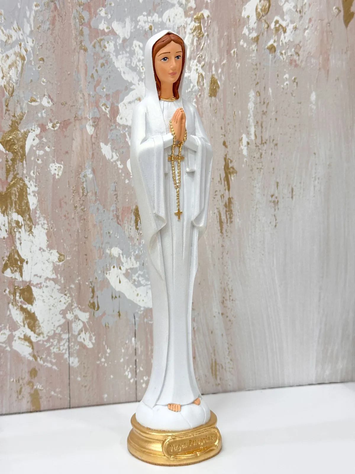 Virgen peregrina de 25cm, en marmolina.